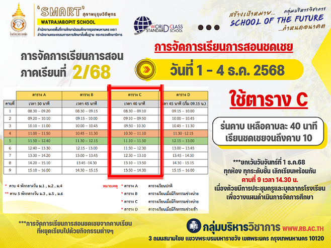 ตาราง C การจัดการเรียนการสอนชดเชย วันที่ 1-4 ธันวาคม 2568 เรียนชดเชยจนถึงคาบ 10