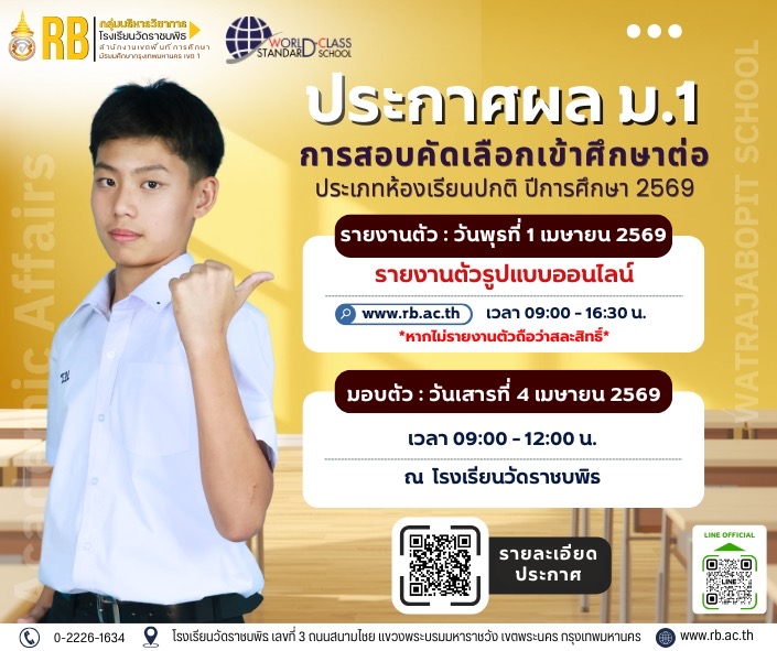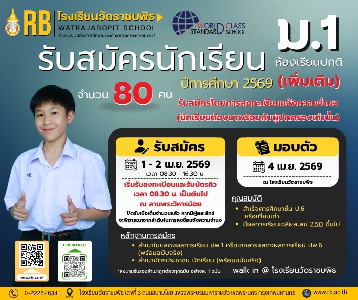ประกาศการสมัครเข้าศึกษาต่อระดับชั้น ม.1 และ 4 โรงเรียนวัดราชบพิธปีการศึกษา 2569 22 มี.ค. 69