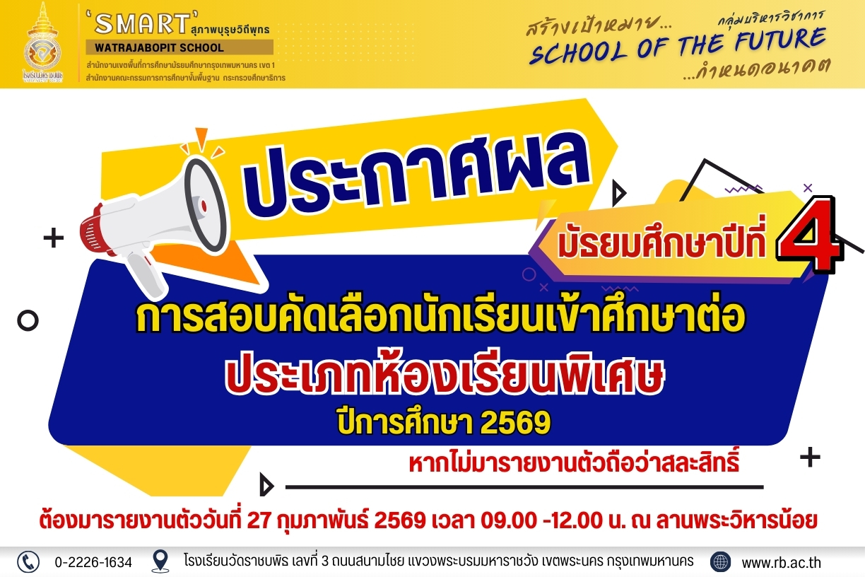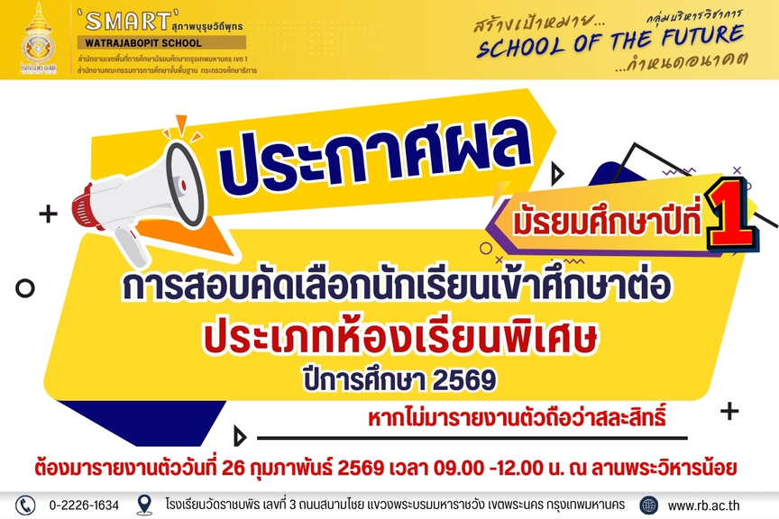 ประกาศรายชื่อนักเรียนผู้มีสิทธิ์สอบเข้าศึกษาต่อในระดับชั้นมัธยมศึกษาปีที่ 1 และ 4 ปีการศึกษา 2569 ประเภทห้องเรียนพิเศษ 18 ก.พ. 69